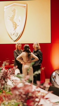 Nach einem herzlichen Champagnerempfang stellte sich unser Team vor und führte die Besucherinnen zu einer kurzen Besichtigung durch den Showroom. Während sie in die kreative Arbeit eintauchten, zog auch der im Showroom präsentierte Ferrari bewundernde Blicke auf sich. Immer wieder bildeten sich kleine Gesprächsrunden um das elegante Modell, dessen skulpturale Präsenz und zeitlose Ästhetik dem Abend eine besonders luxuriöse, exklusive Note verlieh.